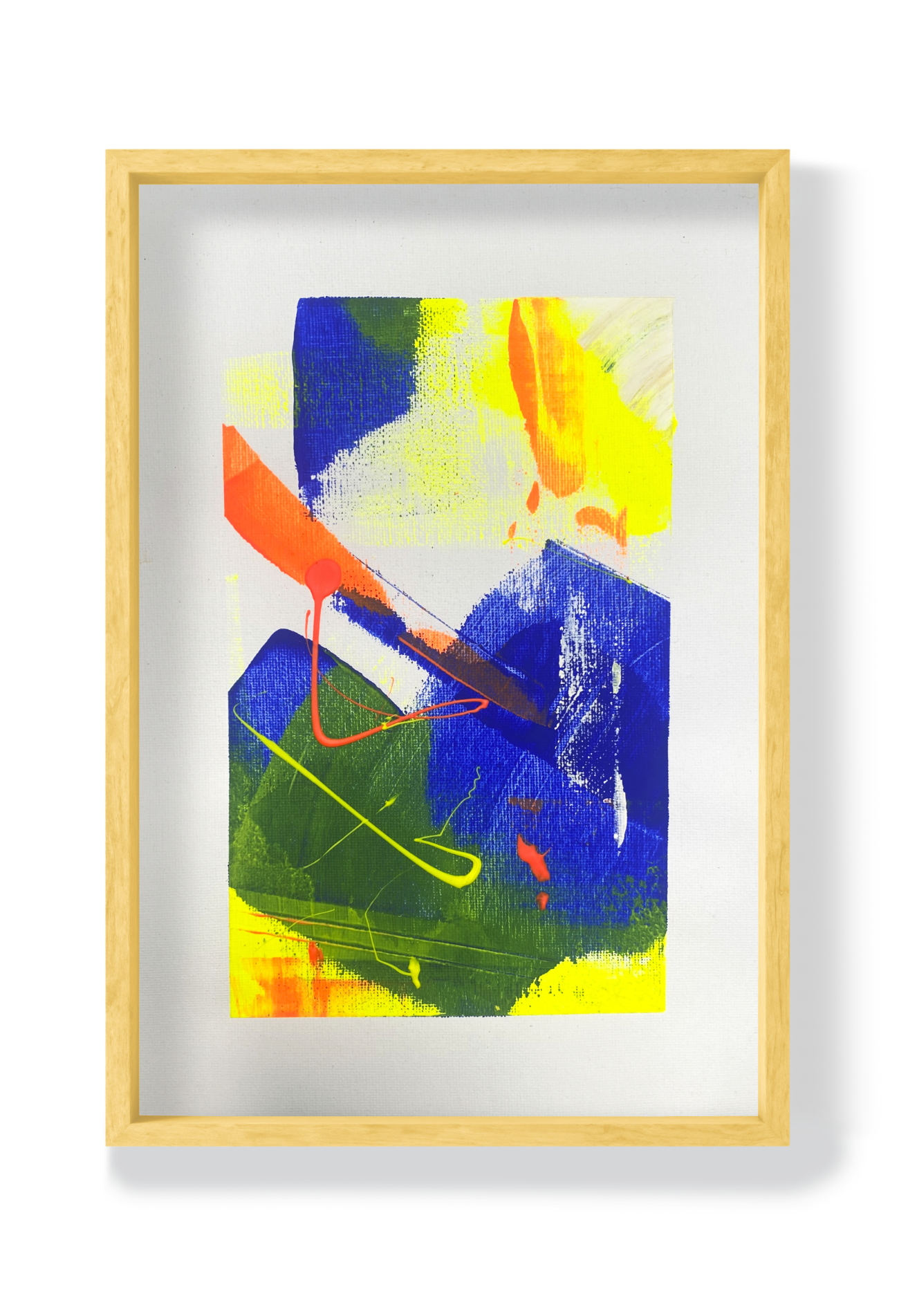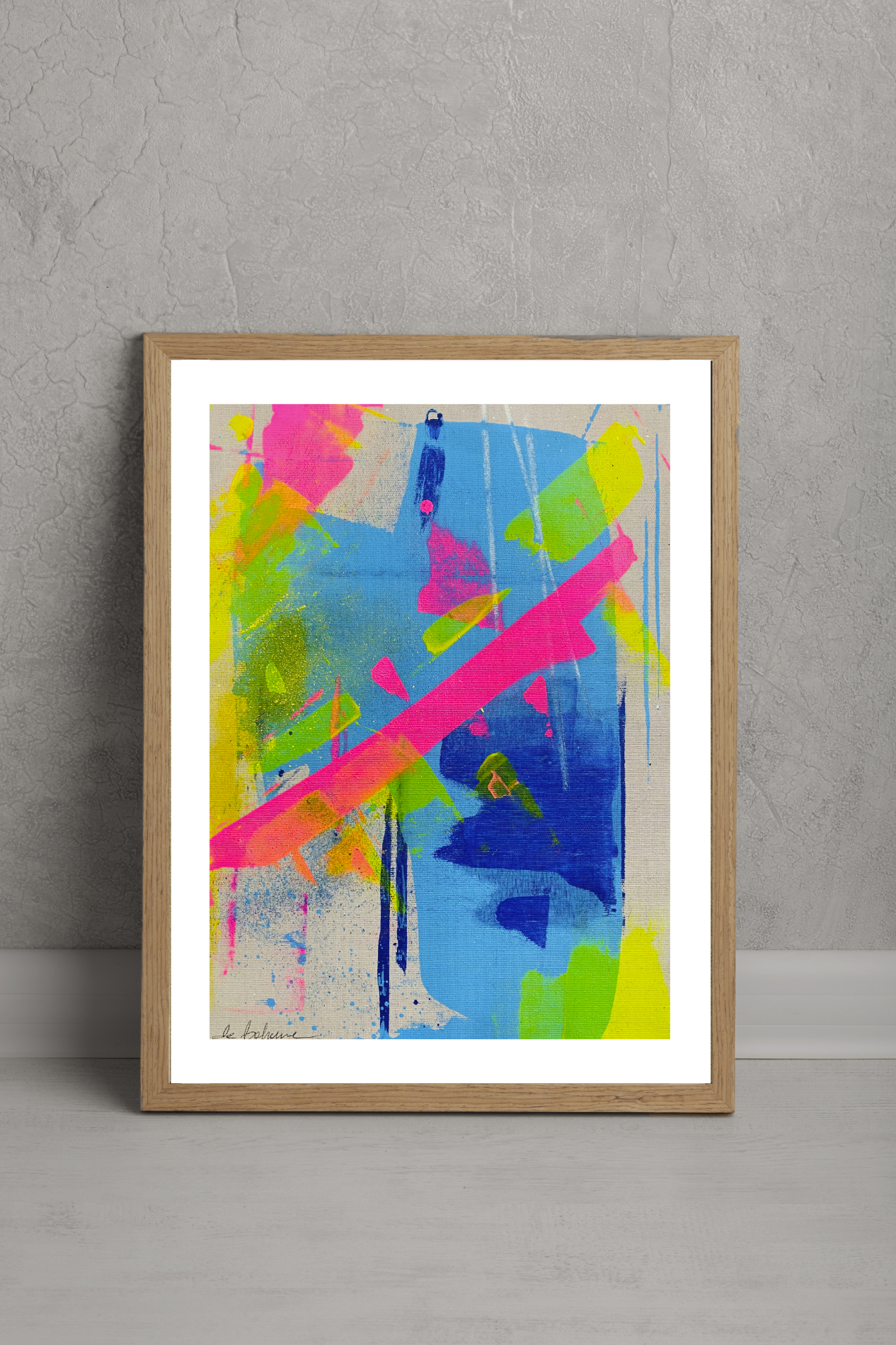 Chaque toile explore la rencontre entre impulsion et structure, entre éclat chromatique et matière brute. Sur un fond souvent laissé nu ou à peine préparé, la peinture vient s’imposer par strates, décharges, élans. Jaune acide, rose fluo, bleu électrique ou rouge incandescent : la palette, vive et volontairement réduite, agit comme un vocabulaire immédiat, instinctif, presque primal.